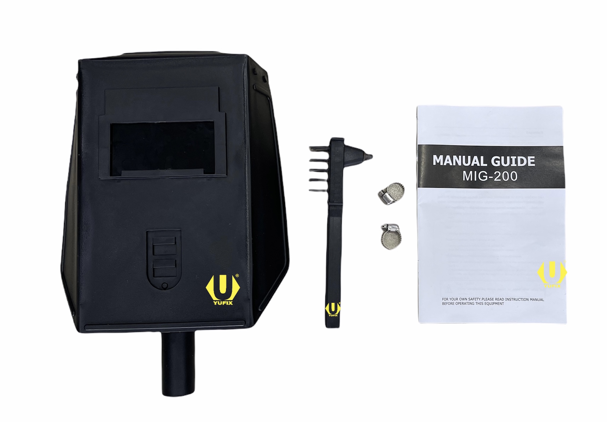 MIG Welding torch, Regulator, Electrode Holder, Earth Clamp, Mask, Wire Brush with Chipping Hammer.